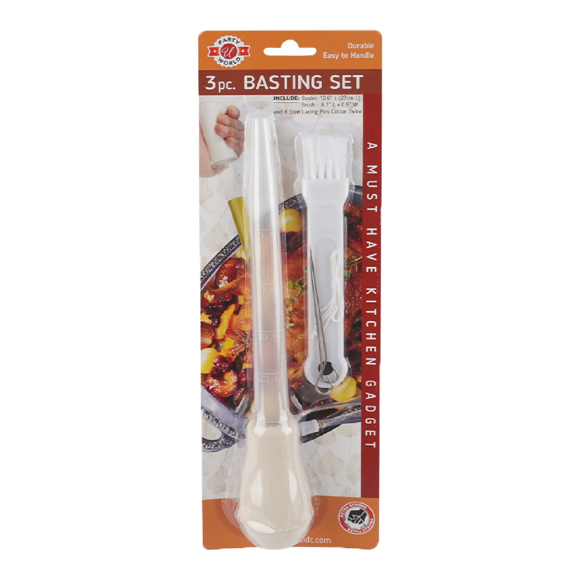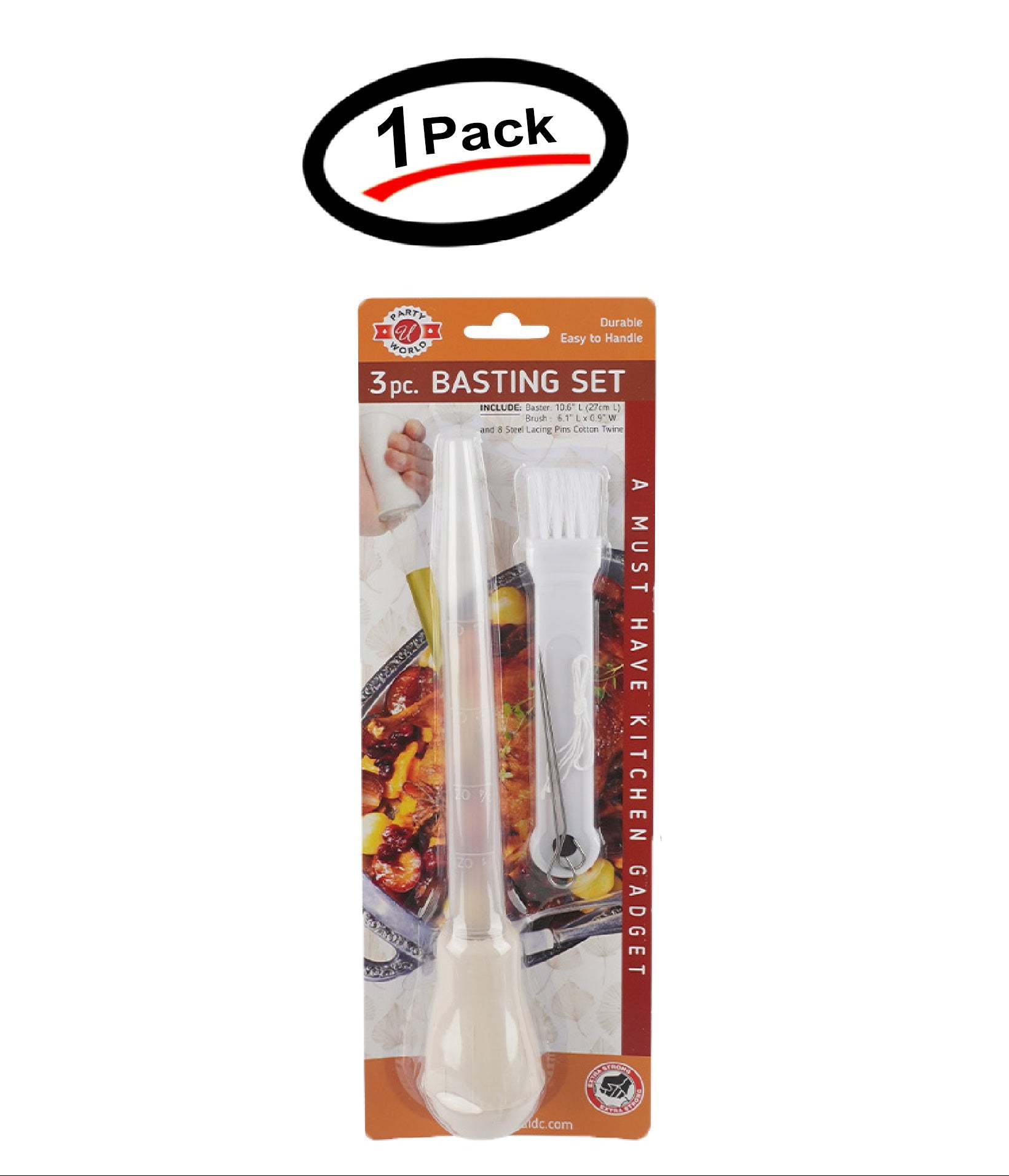 You will get 1 (one) pack = 3 pcs Basting Set – durable baster, brush & lace pins w/ cotton twine. Great for BBQ.