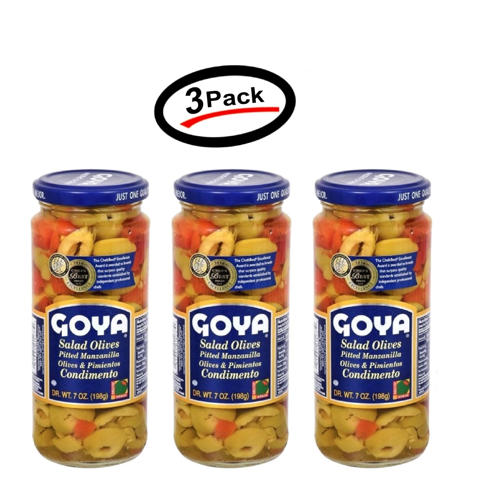 You will get 3 (Three) = 3 Pcs Goya Salad Olives Pitted Manzanilla olives, pimientos & capers 7 oz (198g).