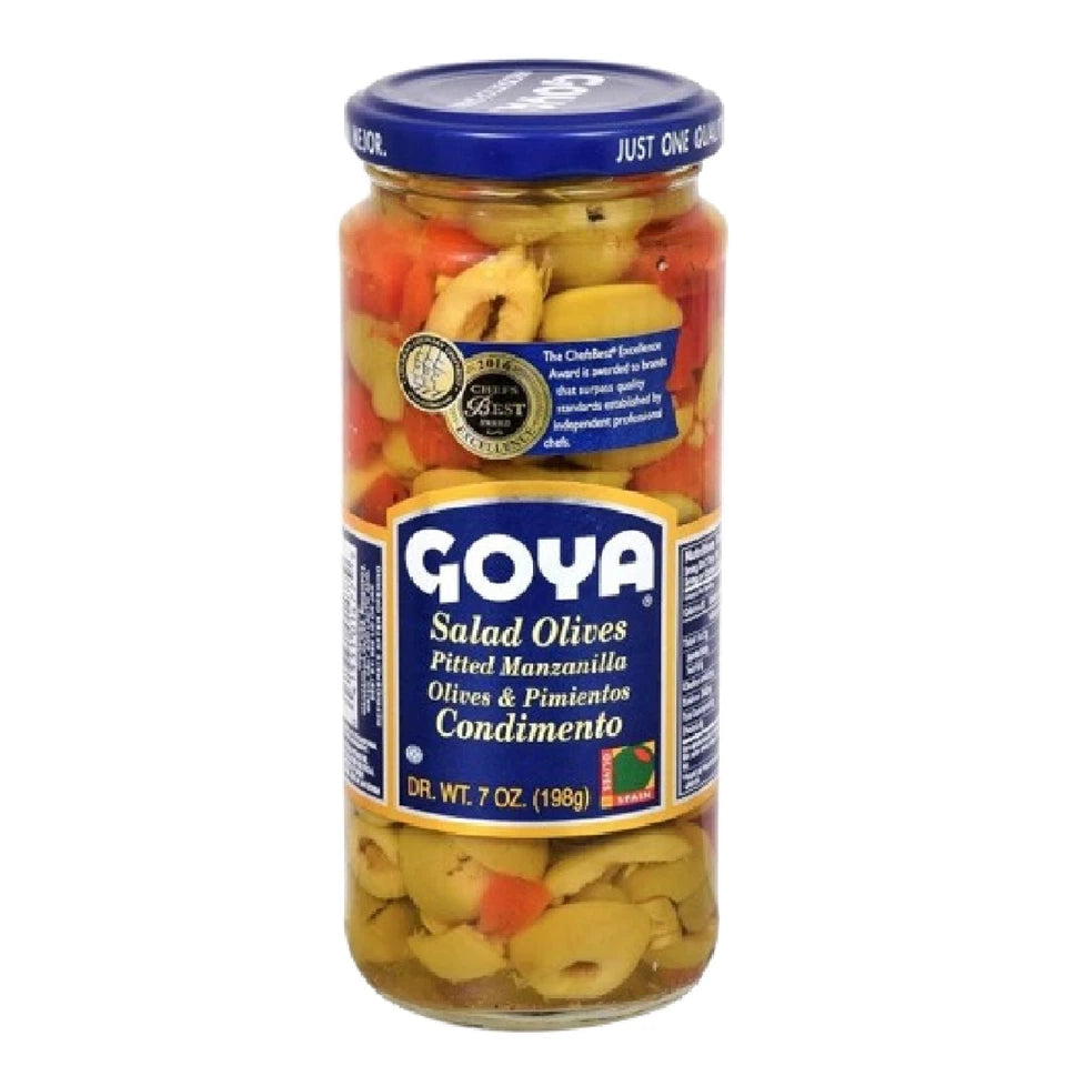 - PITTED MANZANILLA OLIVES & PIMIENTOS: Goya Salad Olives, which are Pitted Manzanilla Spanish Olives with Pimientos are known for their rich taste, firm texture and tangy flavor.